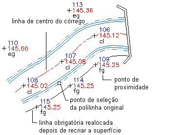 Os pontos de superfície são quaisquer pontos de dados de superfície usados para criar uma TIN que esteja na proximidade aos vértices da polilinha que você seleciona como a linha obrigatória.