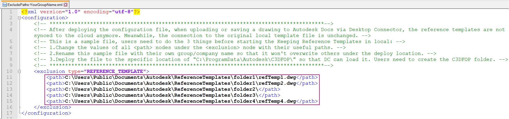 É possível obter o arquivo de configuração ExcludePaths-YourGroupName.xml no local de instalação mais recente do Desktop Connector. Por padrão, esse local é: C:\Program Files\Autodesk\Desktop Connector\FOS\AddIns\C3DProvider\.