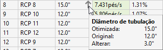 Se o tipo de análise Redimensionar as tubulações e redefinir inversões tiver sido selecionado na página Geral e o diâmetro da tubulação tiver sido redimensionado, esta coluna conterá uma seta para cima ou para baixo. Quando você coloca o cursor sobre a seta, é exibida uma dica de ferramenta que explica como a tubulação foi redimensionada.