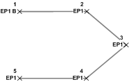Ajustar curva - Curva de três pontos: na ilustração a seguir, cada ponto tem o mesmo nome de imagem EP1, e há três pontos de curva consecutivos (código OC <Ponto na curva>) ou BC (Início da curva> no início da curva). A imagem resultante terá um início de curva (BC) no primeiro ponto EP1, um fim de curva (EC) no terceiro ponto EP1 e a curva irá passar através do segundo ponto EP1. ![]() |