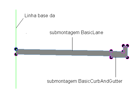 A ilustração a seguir mostra um objeto de montagem simples que representa um lado (pista) de uma estrada de duas pistas. Objetos de submontagem nomeados BasicLane e BasicCurbAndGutter foram adicionados a um alinhamento de linha base, formando uma única pista de rolamento com meio-fio e sarjeta.
