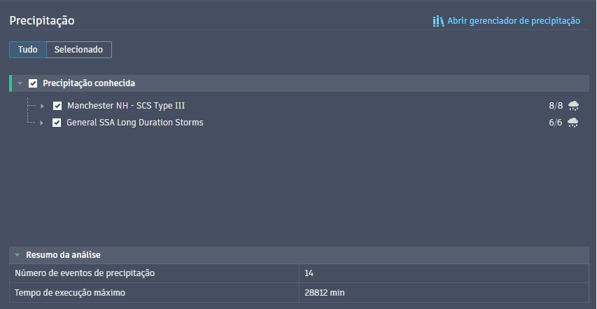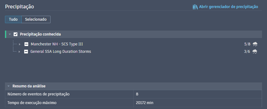 As contagens à direita dos conjuntos de águas pluviais representam o número total de eventos selecionados do número possível de eventos do conjunto. O Resumo da análise na parte inferior exibe o número total de eventos de chuva aplicados ao sistema de drenagem e o tempo máximo especificado de execução dos eventos.