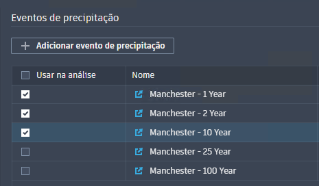 - Na lista de águas pluviais, selecione o conjunto de águas pluviais que contém os eventos de águas pluviais desejados.