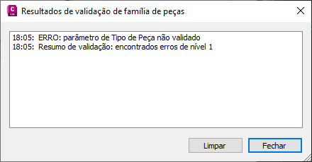 caixa de diálogo do código de erro resultante quando a peça for inválida