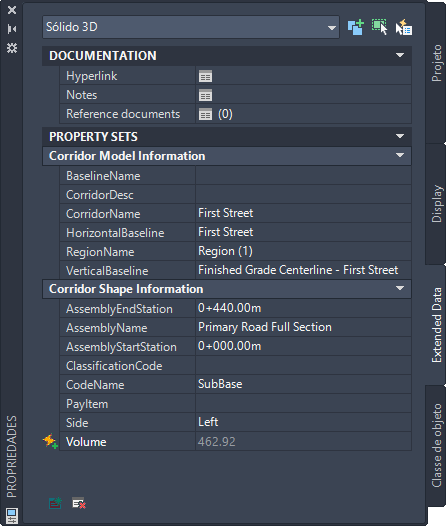 Por padrão, o Autodesk Civil 3D inclui três definições de conjuntos de propriedades que se aplicam aos corredores, sólidos e corpos 3D: