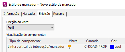 Os estilos de marcador são usados para controlar a aparência de objetos de interseção em gráficos de perfil longitudinal. A aparência do estilo de marcador é controlada na guia Exibição da caixa de diálogo Estilo de marcador. Na lista Direção da exibição, selecione Perfil e edite o modo como o estilo de marcador é configurado para o gráfico do perfil longitudinal. Um único componente controla a exibição do marcador (usado para exibir perfis de interseção, linhas de recurso, imagens do levantamento topográfico e polilinhas 3D) e da linha vertical da interseção (usada para exibir alinhamentos de interseção).