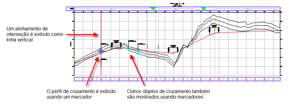Você pode adicionar interseções a gráficos de perfil longitudinal para identificar onde objetos lineares cruzam o perfil relativo ao alinhamento principal.