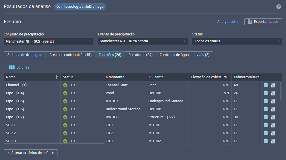 Quando a análise do sistema for concluída, o resultado será relatado no nível do sistema e como categorias de objeto: Fluxos de entrada, Tubulações, Estruturas e Águas pluviais.
