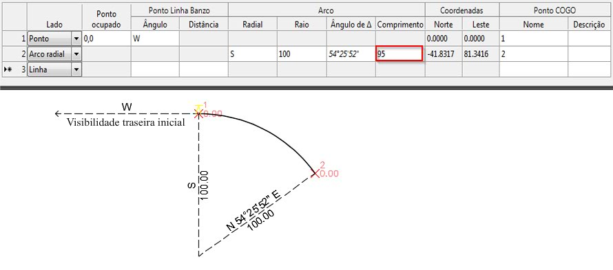 Alterar o raio ou ângulo delta recalcula o comprimento. Alterar o comprimento recalcula o ângulo delta.
