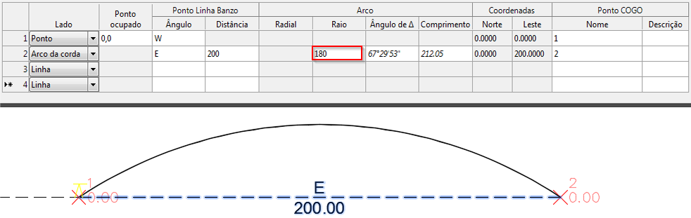 Ao inserir dados para arcos de banzo, você deve especificar um ângulo e uma distância e, a seguir, poderá especificar um raio, ângulo delta ou comprimento. O valor que você inserir diretamente para o raio, ângulo delta ou comprimento é exibido em fonte normal, e os valores calculados são exibidos em itálico. Na ilustração a seguir, 180 foi inserido para o raio e o ângulo delta 67° 29' 53" e o comprimento 212.05 são calculados.