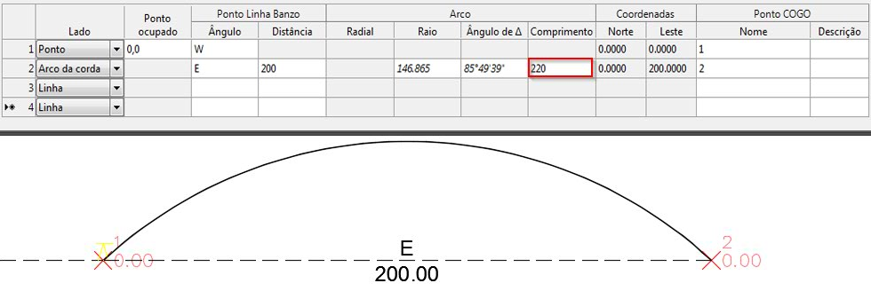 Você pode alterar manualmente os valores exibidos em itálico para recalcular os outros valores, que são exibidos em itálico. Na ilustração a seguir, 220 foi inserido para o comprimento e o raio 146.87 e ângulo delta 85° 49' 39" foram recalculados.