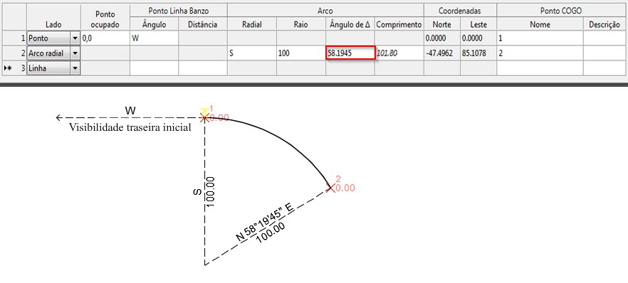 Na ilustração a seguir, 58.1945 foi inserido para o ângulo delta e o comprimento 101.80 é calculado.