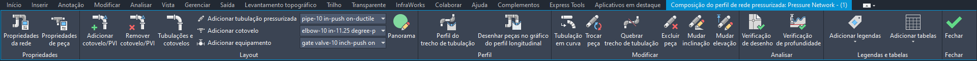 Peças de rede pressurizada devem ser adicionados à um gráfico do perfil longitudinal antes de poder acessar esses comandos.