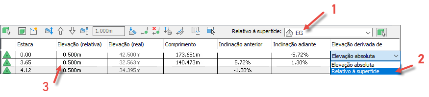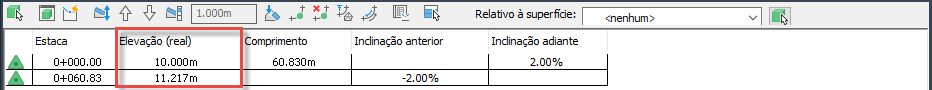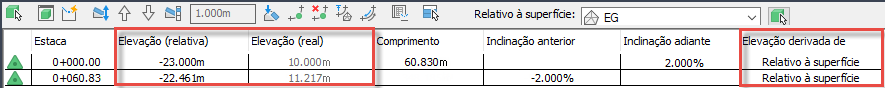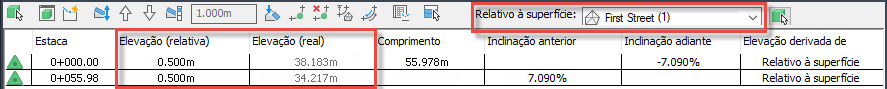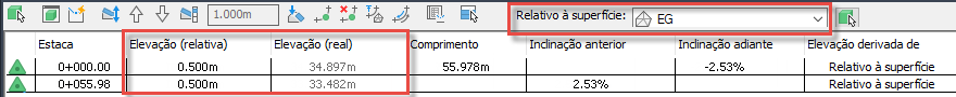 Se for alterado para ser relativo à superfície EG, a elevação real permanece a mesma e a coluna Elevação (relativa) mostra a diferença de elevação entre a linha de recurso e a superfície.