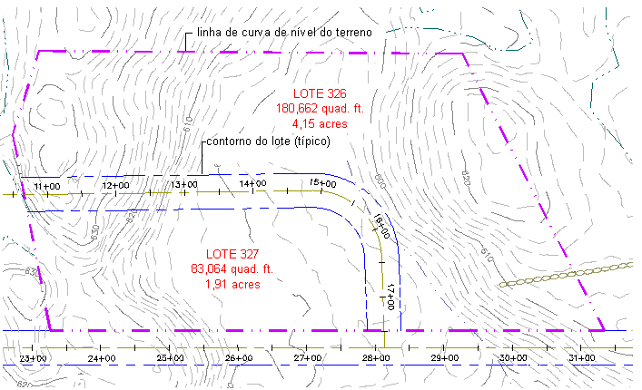 Lotes em um conjunto podem ser desanexados ou concernentes, mas não podem se substituir. Se você tentar substituir dois lotes, a região de sobreposição definirá um terceiro lote. Da mesma forma, se um alinhamento cruza um lote, ele o divide em dois. Na ilustração a seguir, antes de adicionar o alinhamento, o terreno foi um só lote: