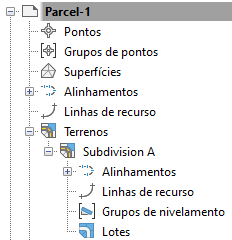 Um desenho pode incluir qualquer número de terrenos, mas cada terreno somente tem uma coleção de lotes. Nenhum lote pode pertencer a mais de um terreno. Você pode ver essas relações na coleção Terrenos no Toolspace, na guia Prospector: