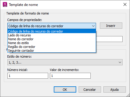 Além disso, para as propriedades Nome do estilo e Próximo contador, é possível especificar diversas propriedades para os nomes de linha do recurso que ajudam a identificá-las em relação ao corredor principal, incluindo o Código da linha do recurso do corredor, Nome do corredor, Região do corredor Lado do recurso.