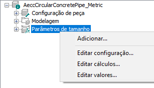 - Na janela Família de peças, clique com o botão direito do mouse no nó Parâmetros de tamanho e clique em Editar os valores.