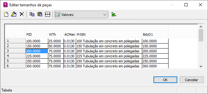 - Para alterar os valores para os tamanhos de tubulação, selecione a linha e célula de tamanho. Clique duas vezes para editar.