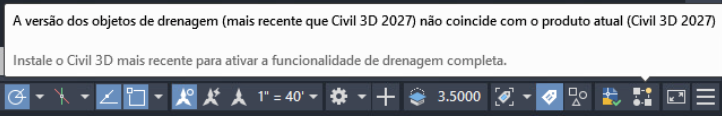 O ícone de compatibilidade aparece na barra de status e indica se os objetos de drenagem no desenho coincidem com a versão atual do Civil 3D. Passe o cursor do mouse sobre o ícone para exibir uma dica de ferramenta que explica o status de compatibilidade.
