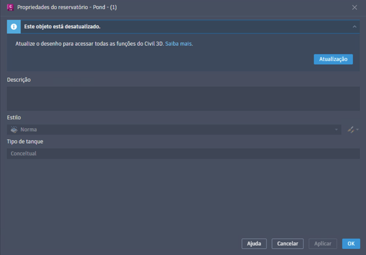 - Quando o objeto foi criado em uma versão mais antiga do Civil 3D, o sinal exibe: "Este objeto está desatualizado.". Atualize o desenho para acessar todas as funções do Civil 3D. Clique no botão Atualizar para atualizar o objeto para a versão atual. Após a atualização, você poderá editar o objeto completamente.