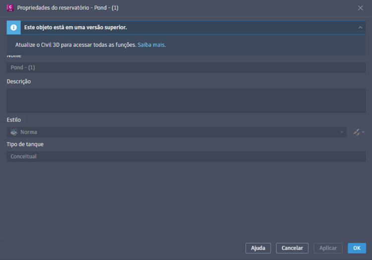 - Quando o objeto foi criado em uma versão mais recente do Civil 3D, o sinal exibe: "Este objeto está em uma versão posterior.". Atualize o Civil 3D para acessar todas as funções. Neste caso, o botão Atualizar não está disponível porque não é possível rebaixar a versão do desenho. Você deve instalar uma versão mais recente do Civil 3D para editar o objeto.