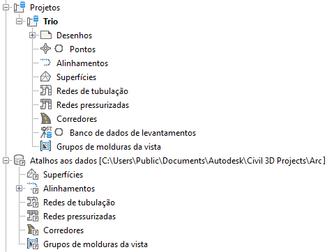 A figura mostra as coleções para um projeto do Vault denominado Trio e uma atalho de dados do projeto denominado Arc. Ambos os tipos de projeto são criados a partir do template padrão de projeto. Como resultado, eles têm coleções idênticas de superfícies, alinhamentos e outros objetos que podem ser referenciados em múltiplos desenhos.