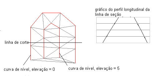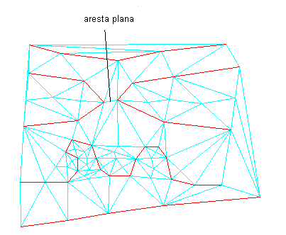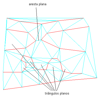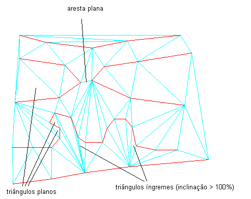 A ilustração a seguir mostra uma superfície com poucas áreas onde os triângulos (em ciano) de uma superfície são criados a partir das linhas de curvas de nível vermelhas. Alguns triângulos planos e algumas margens planas são indicadas: