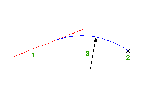 A ilustração mostra uma curva flutuante de uma entidade existente (1) até um ponto de passagem (2) e um raio mínimo (3). Este tipo de curva também pode ser desenhado a partir de um valor K especificado.