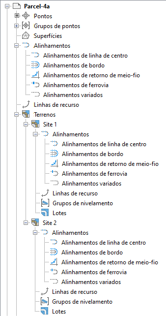 Expanda o nome de um alinhamento individual para exibir as vistas de superelevação, vistas do declive transversal, perfis, gráficos do perfil longitudinal e grupos de linhas de amostra que estão associadas com o alinhamento.