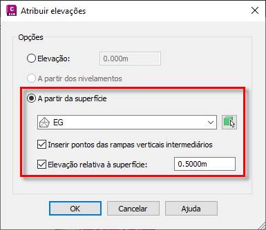 Na caixa de diálogo Atribuir elevações, selecione a opção A partir da superfície.