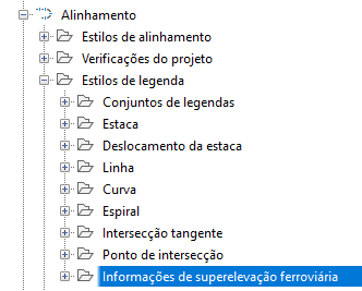 Os estilos de legenda de informações de superelevação ferroviária estão disponíveis na coleção Estilos de legenda de alinhamento: