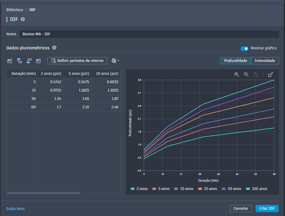 A tabela e o gráfico de curva IDF podem exibir dados de profundidade ou de intensidade. Os dados são exibidos usando as unidades definidas no desenho de origem.