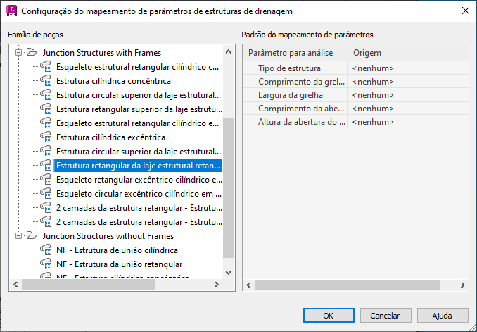 Mapear parâmetros de estruturas de drenagem. Na caixa de diálogo Mapear parâmetros de estruturas de drenagem, clique em Configuração do mapeamento.