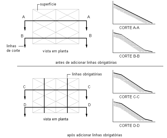 Linhas obrigatórias são críticas para criar um modelo de superfície preciso porque elas são as interpolações dos dados, não somente os dados, que determinam o formato do modelo.