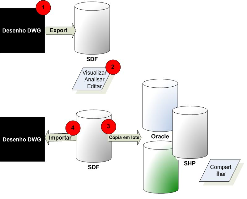 | Exporte o mapa ou camadas individuais de desenhos para o formato SDF da Autodesk, ou para SHP ou Oracle. A seguir, utilize a Cópia em lote para mudá-lo para outros formatos. | Os dados DWG originais não são alterados. |