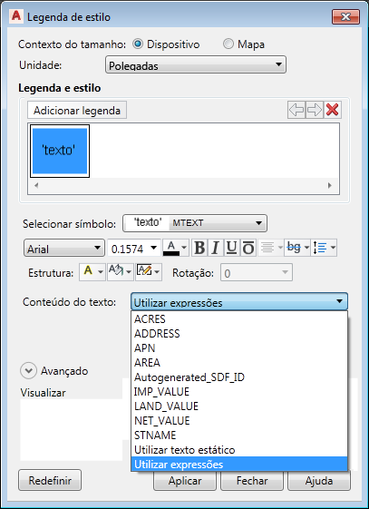 - Na caixa de diálogo Legenda de estilo, para Conteúdo do texto, selecione Utilizar a expressão.