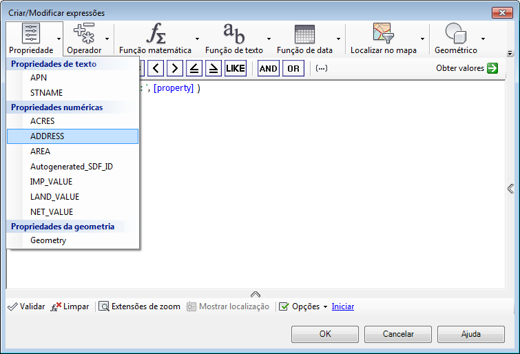 - Para substituir a primeira entrada de propriedade, selecione-a e clique em Propriedade no topo da janela Criar/modificar expressões. Selecione a propriedade numérica ENDEREÇO.