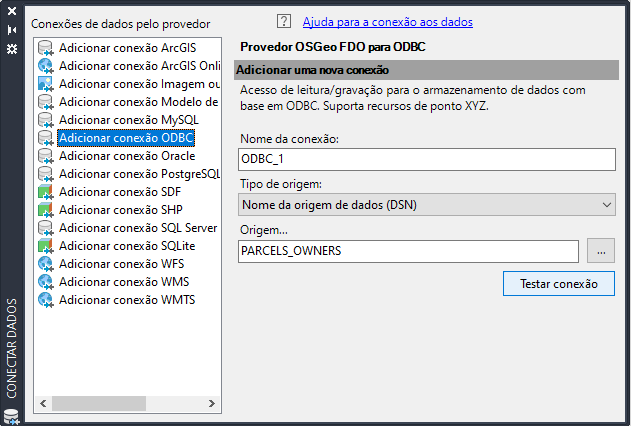 Especifique a nova conexão na janela Conectar dados. Não adicione quaisquer camadas específicas da classe de recurso a partir da origem ODBC para o mapa. Todas as informações ficam automaticamente disponíveis para o Conjunto de ferramentas do AutoCAD Map 3D quando você se conecta à origem ODBC.