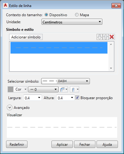 - Para Selecionar símbolo, selecione um padrão tracejado para as linhas.
