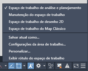 - Espaço de trabalho da faixa de opções de análise e planejamento — personalizado para comandos do Conjunto de ferramentas do AutoCAD Map 3D. A maioria dos tutoriais e vídeos assumem que você está usando este espaço de trabalho.