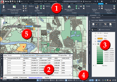 A faixa de opções e as barras de ferramentas. Os comandos para as tarefas de mapeamento.