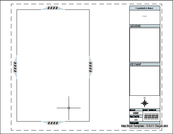 - Os polígonos cinzas em torno da borda da viewport principal são setas adjacentes. Eles irão conter os nomes das miniaturas adjacentes no livro de mapas, para que seja possível localizar a próxima seção do mapa em qualquer direção. As setas adjacentes são objetos individuais e não se movem com a viewport principal. É possível movê-las manualmente. No entanto, elas vinculam às miniaturas do adjacentes do mapa automaticamente. Não é necessário conectá-las manualmente.