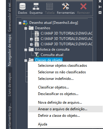 - Anexe o arquivo de definição de objeto clicando com o botão direito em Classes de objetos na guia Navegador de mapas do Painel de tarefas e clicando em Anexar arquivo de definição.