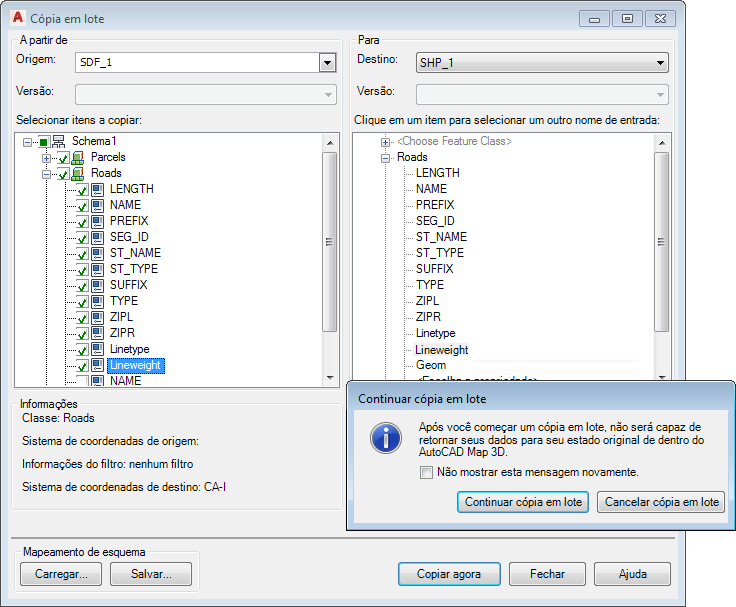 Copie a camada de Estradas do formato SDF para o formato SHP usando a Cópia em lote.