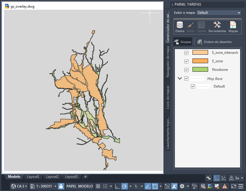 Este mapa sobrepõe duas camadas (uma zona de inundação e uma zona empresarial). É possível usar a sobreposição para ver onde os dois efetuam a intersecção. Essa área se torna uma nova camada, que é possível estilizar e salvar para um arquivo e usar como um novo armazenamento de dados.