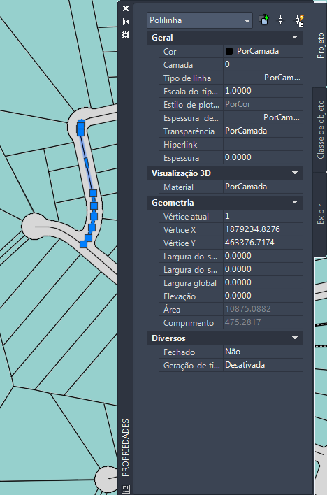 4. Observe que a cor das polilinhas é PorCamada. Verifique a área inferior da guia Projeto da paleta de Propriedades para visualizar os dados do objeto.