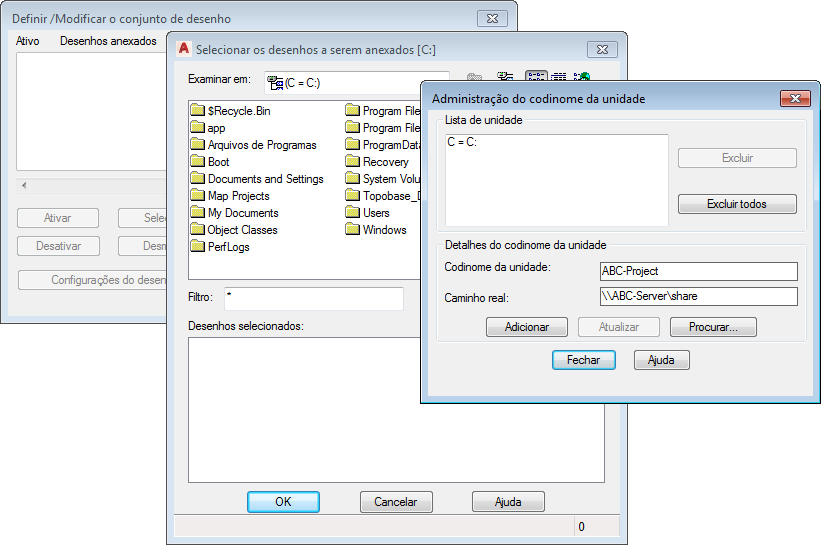 Um codinome de unidade permite que vários usuários utilizem o mesmo nome de caminho para um desenho armazenado em uma unidade compartilhada. Ele permite que cada usuário mapeie a unidade com uma letra diferente de unidade de disco.