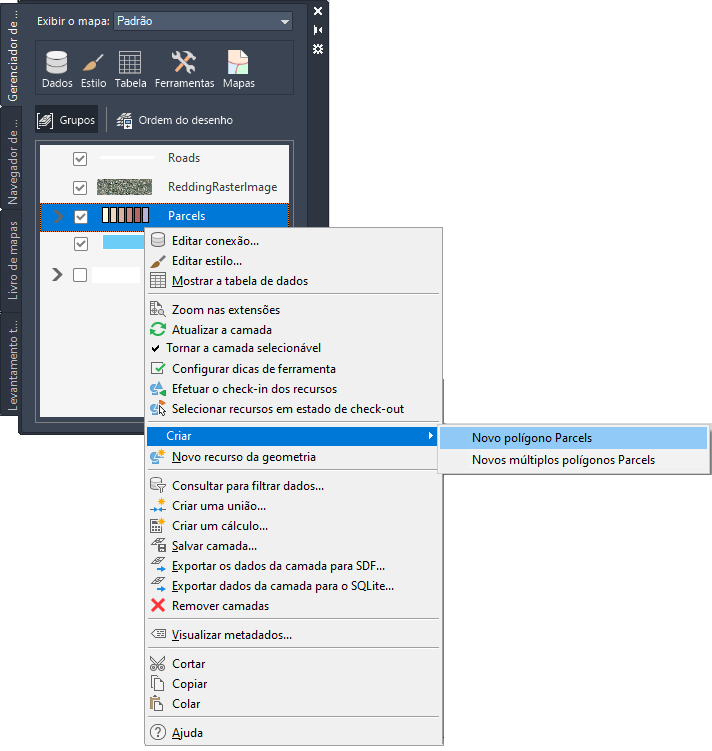 Nota: Quando selecionar um item no Painel de tarefas, ele também pode exibir uma guia contextual na faixa de opções. Por exemplo, selecione uma classe de objeto no Navegador de mapas para ver a guia Classificação. Selecione uma camada de recurso no Gerenciador de exibição para ver a guia Camada de vetor.