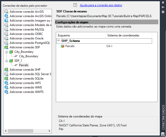 Conectar dados exibe informações sobre todas as origens de dados não-DWG anexadas, mesmo se não utilizar Conectar de dados para anexá-las. Por exemplo, o arquivo SDF arrastado e solto em seu mapa é listado na janela Conectar dados.